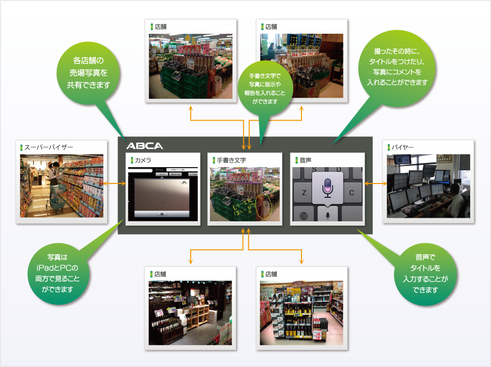 チェーンオペレーションにとって、各店舗の売場の出来栄えを把握することは重要なことです。しかし、同時に多くの店舗を見て回ることは、時間的にも費用的にもできませんでした。 ABCAアルバムでは、スパーバイザーやバイヤーだけでなく、各店長もリアルタイムで、互いの売場の出来栄えをみることができます。