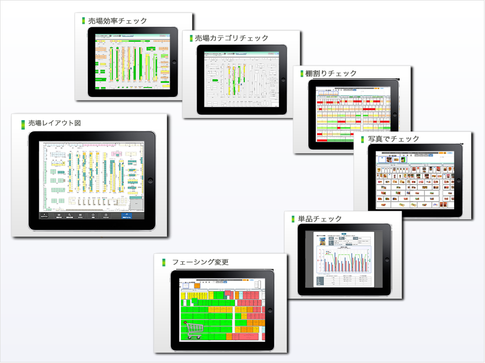 全ての分析は、売場レイアウト図をタップするだけで始まります。売場生産性、棚割り評価、単品分析がワンタッチで行えます。
