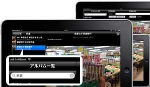 撮った写真は瞬時に、他店、本部と共有できます。インターネット経由で、共有アルバムにアクセスすれば、写真比較が簡単にできます。 店別、売場別、イベント別、その他任意のキーワードで検索が可能です。